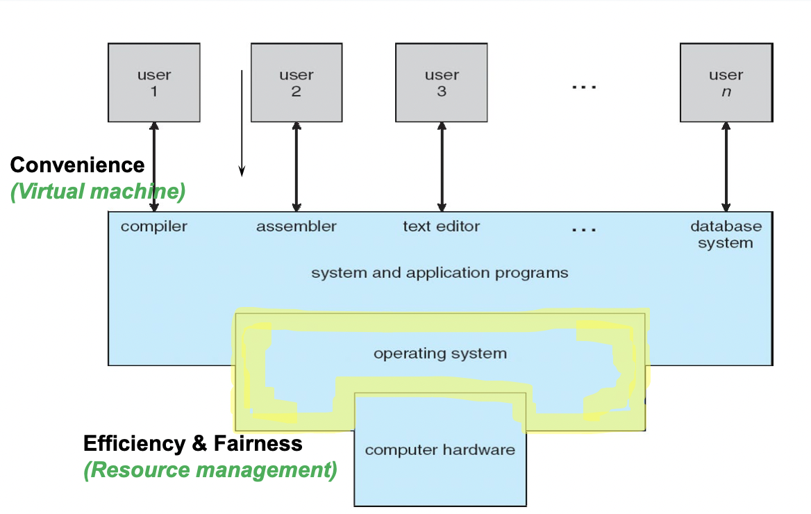 - 쉽게 말하면, 아래 그림과 같이 사용자가 프로그램을 사용할 수 있도록 하드웨어 자원과 소프트웨어 자원을 운영 관리하며 편리함을 제공한다.