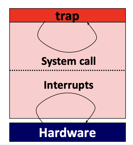 - Trap : 의도적으로 인터럽트를 일으킨다. 따라서 trap 명령어를 실행하면 system call이 일어난다. Trap에는 number가 포함되어 있어서 syscall이 어디서 왜 요청되었는지 알 수 있다.