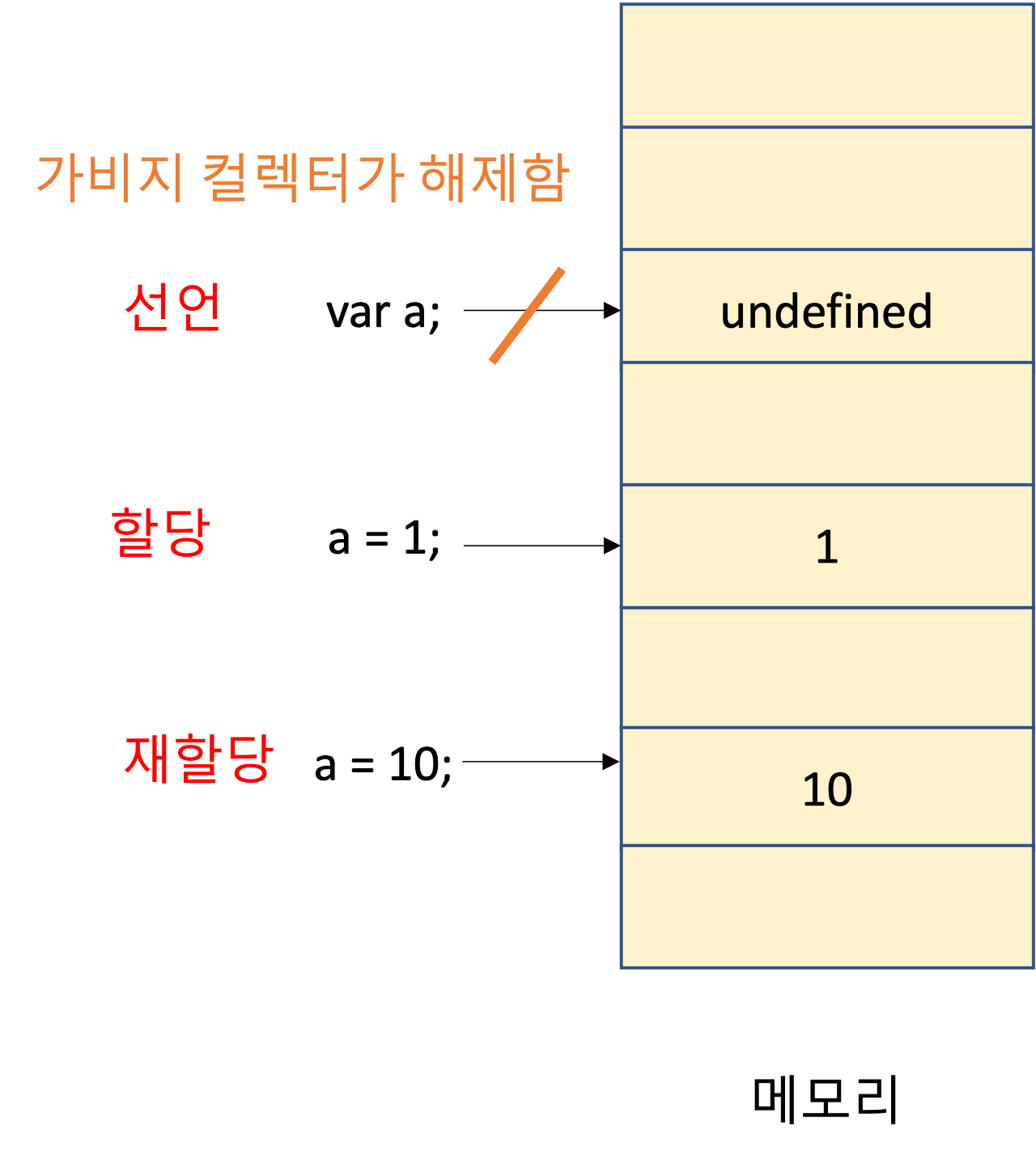 따라서 자바스크립트에서는 개발자의 직접적인 메모리 제어를 허용하지 않음.