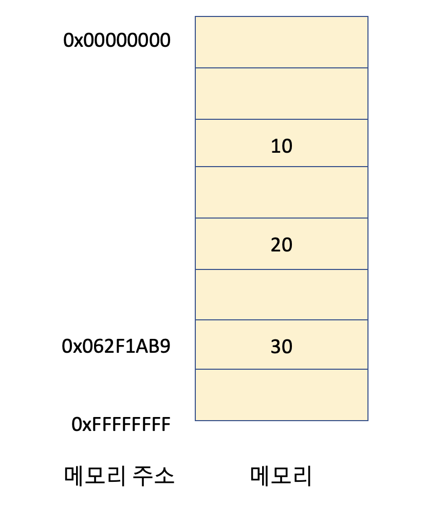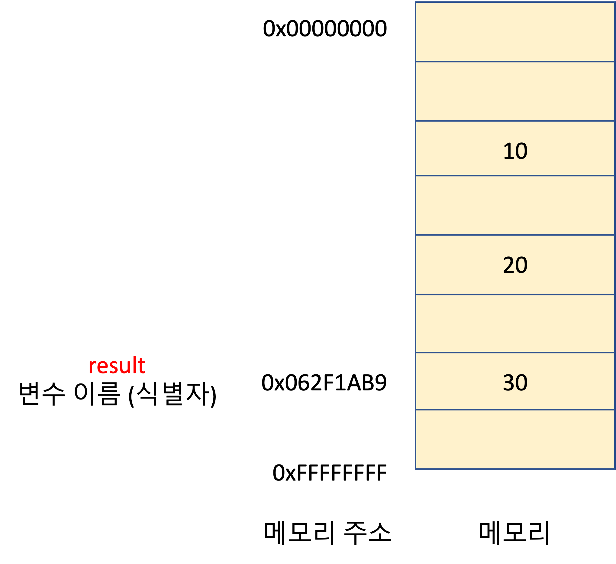 따라서 위처럼 메모리 공간 주소로 직접 접근하지 않고, 아래와 같이 변수를 통해서 메모리 공간에 저장된 값을 사용할 수 있게 된다.