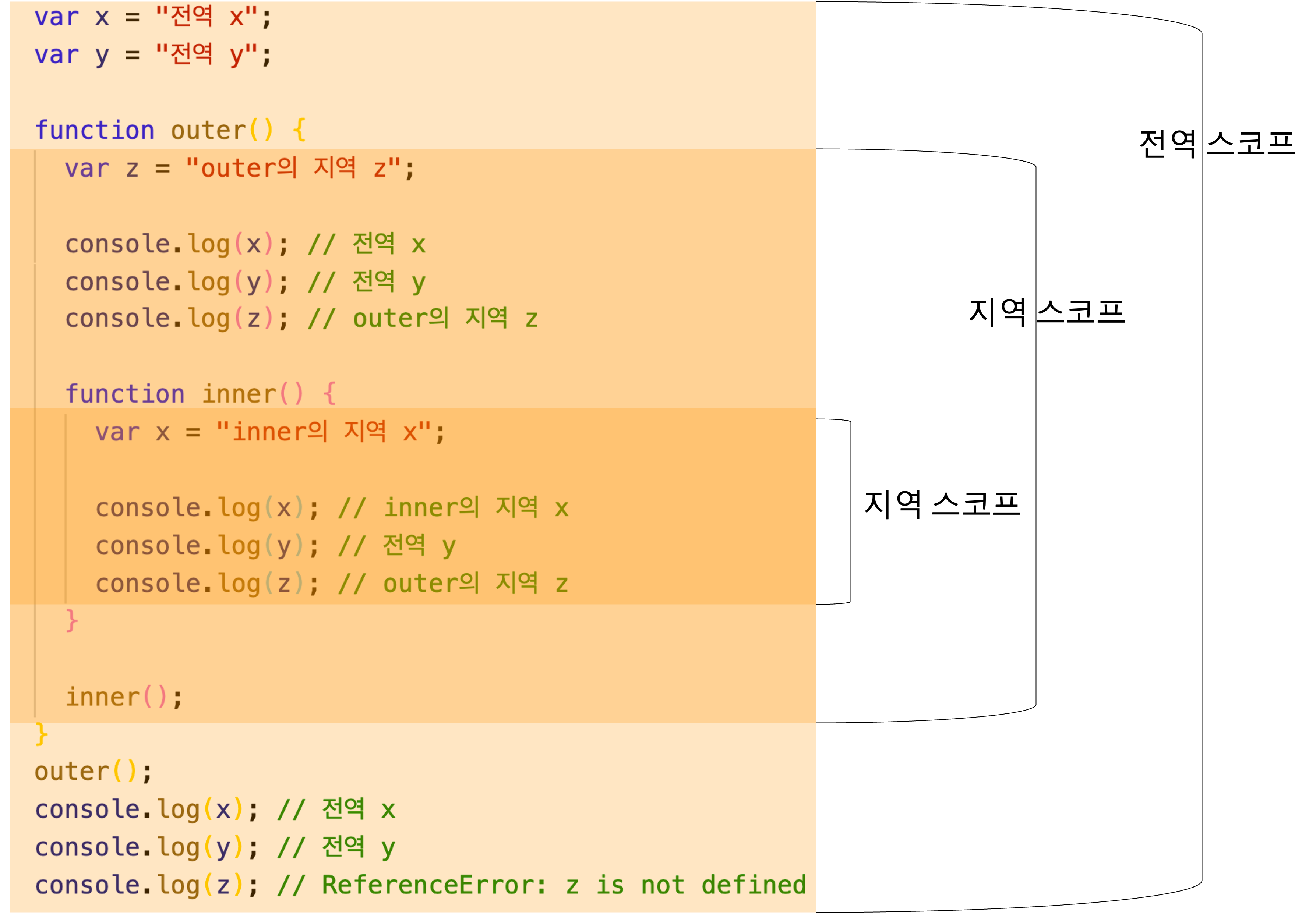 | 지역 local | 함수 몸체 내부 | 지역 스코프 | 지역 변수 | 자신의 지역 스코프와 하위 지역 스코프 |