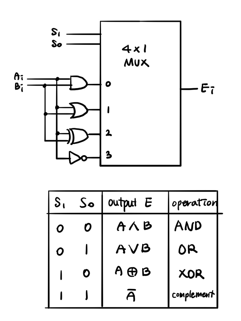 따라서 4가지 논리 연산만 구현한 회로는 다음과 같다.